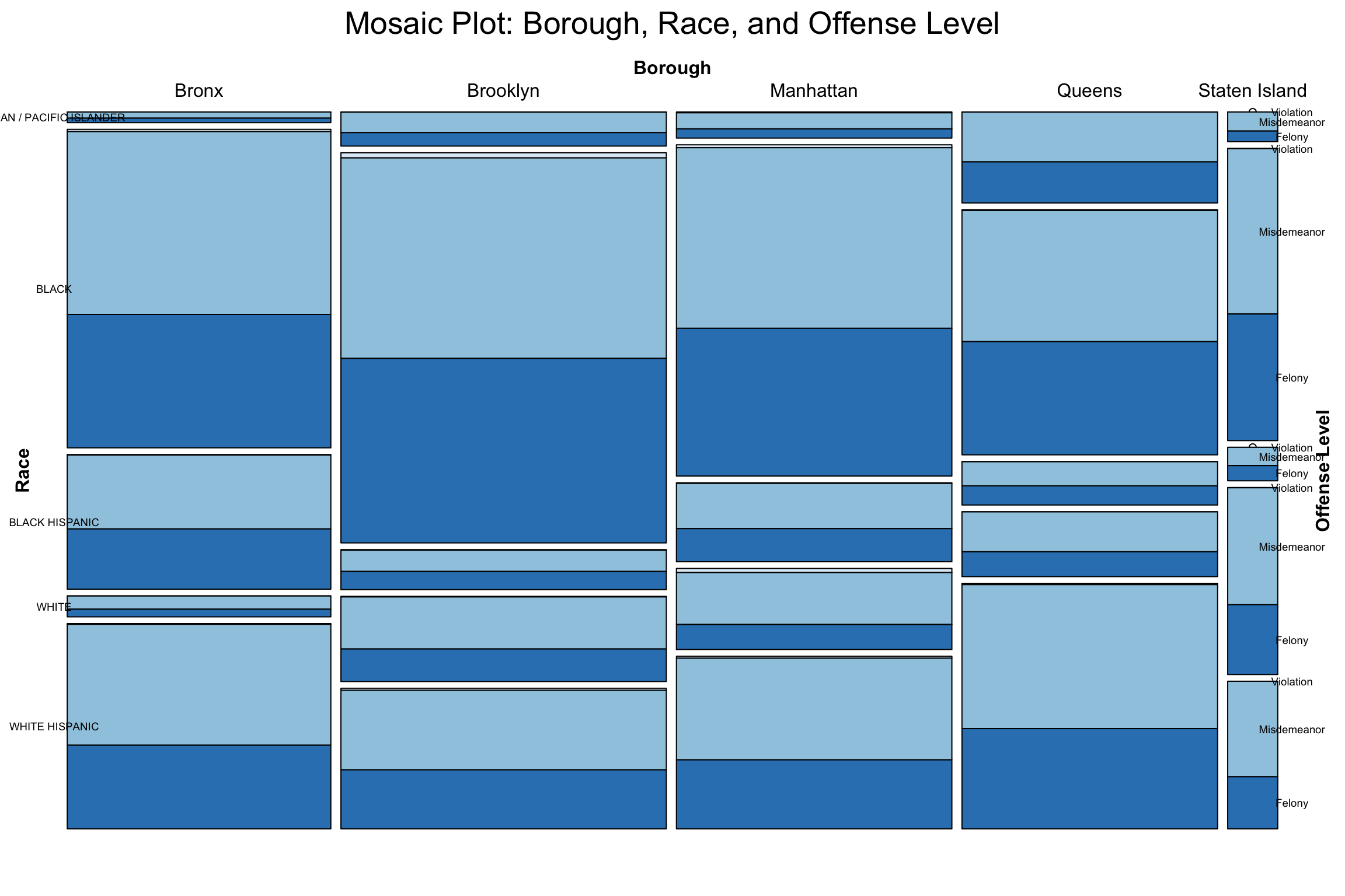 The mosaic plot reveals that while offense levels show consistent patterns across all boroughs - approximately half of the arrests are for felonies, nearly half are for misdemeanors, and violations constitute only a small proportion - there are striking disparities in the racial composition of arrests across boroughs, highlighting that borough is statistically significant to race. For instance, Black individuals dominate arrests in the Brooklyn, with proportions notably higher than in other boroughs, indicating a geographic concentration of demographic composition. In contrast, White individuals are more frequently arrested in Staten Island compared to the others, highlighting localized variations in racial arrest patterns. Similarly, White Hispanic and Black Hispanic individuals exhibit different arrest distributions, with greater white Hispanic representation in Brooklyn and Queens, and greater black Hispanic in Bronx and Manhattan. These variations point to the conclusion that the borough of residence plays a significant role in shaping arrest patterns across racial groups.