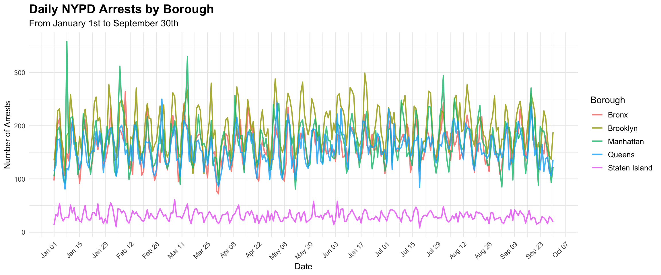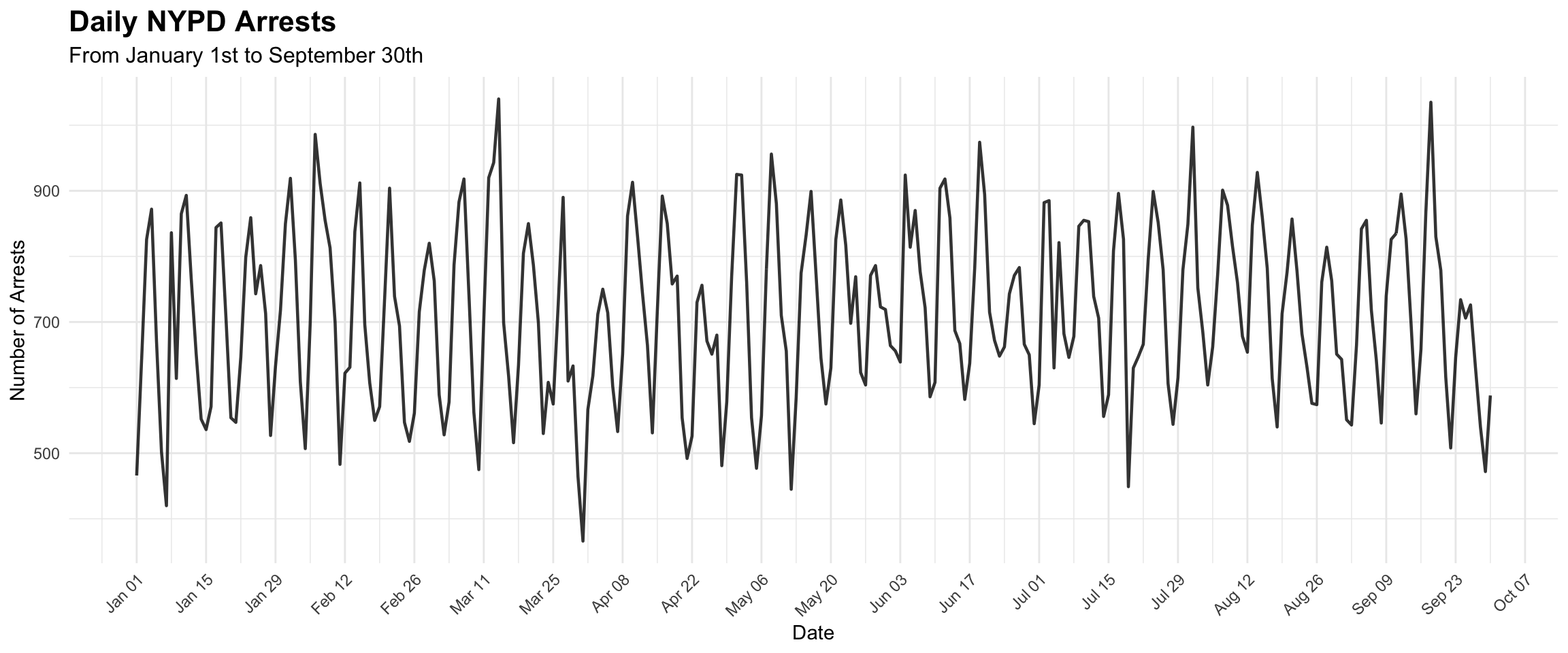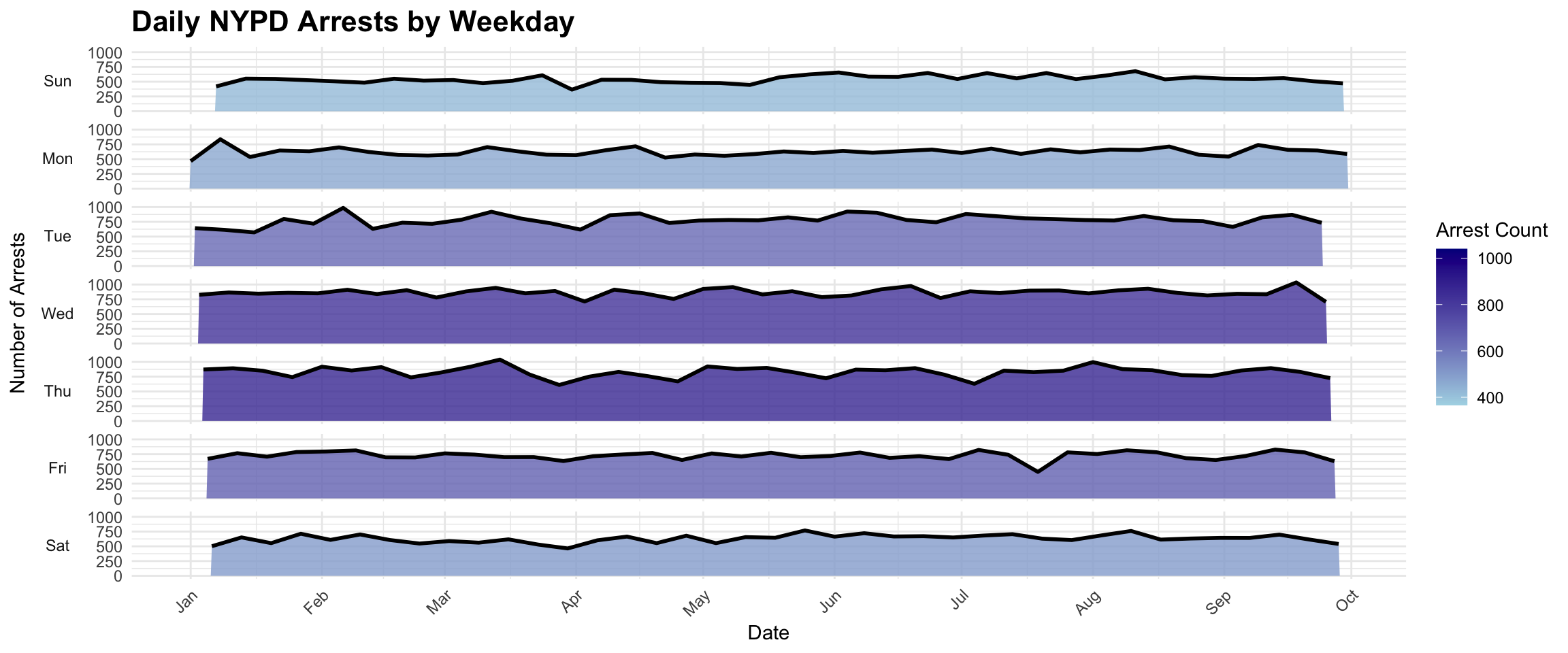 age_count <- data |>group_by(AGE_GROUP) |>summarize(Count =n())plot1 <-ggplot(age_count, aes(x = AGE_GROUP, y = Count)) +geom_bar(stat ="identity", fill ="lightblue") +ggtitle("Number of Arrests by Age group") +xlab("Perp Age Group") +ylab("Number of Arrests")gender_counts <- data |>group_by(PERP_SEX) |>summarize(Count =n()) |>mutate(Percentage = Count /sum(Count) *100,Label =paste0(PERP_SEX, " ", round(Percentage, 1), "%"),Position =cumsum(Count) - Count /2)plot2 <-ggplot(gender_counts, aes(x =2, y = Count, fill = PERP_SEX)) +geom_bar(stat ="identity", width =1, color ="white") +coord_polar("y", start =0) +labs(title ="Perp Gender") +theme_void() +scale_fill_manual(values =c("steelblue", "lightblue")) +geom_text(aes(x =3, y = Position, label = Label), color ="black", size =5) +theme(legend.position ="none") +xlim(0.5, 3)race_count <- data |>group_by(PERP_RACE) |>summarize(Count =n()) |>arrange(desc(Count))plot3 <-ggplot(race_count, aes(x =reorder(PERP_RACE, -Count), y = Count)) +geom_bar(stat ="identity", fill ="lightblue") +ggtitle("Number of Arrests by PERP_RACE") +xlab("PERP_RACE") +ylab("Number of Arrests") +theme(axis.text.x =element_text(angle =45, hjust =1))top_15_ofns_desc <- data |>group_by(OFNS_DESC) |>summarise(Count =n()) |>arrange(desc(Count)) |>head(15)plot4 <-ggplot(top_15_ofns_desc, aes(x =reorder(OFNS_DESC, Count), y = Count)) +geom_bar(stat ="identity", fill ="lightblue") +labs(title ="Top 15 Arrest Categories",x ="Offense Description", y ="Number of Arrests") +coord_flip()layout <-"\nABD\nCCD"(plot1 + plot2 + plot3) + plot4 +plot_layout(design = layout, widths =c(1, 1))